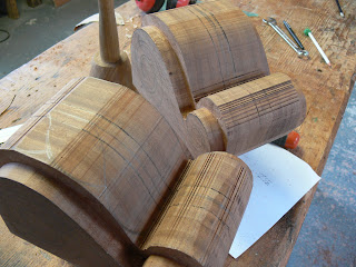 The blocks were made up of a number of lengths of utile which were laminated together. The basic shape was cut out on the bandsaw and the design on the front face was raised by routing away the waste on either side. Each piece was then handcarved and sanded.